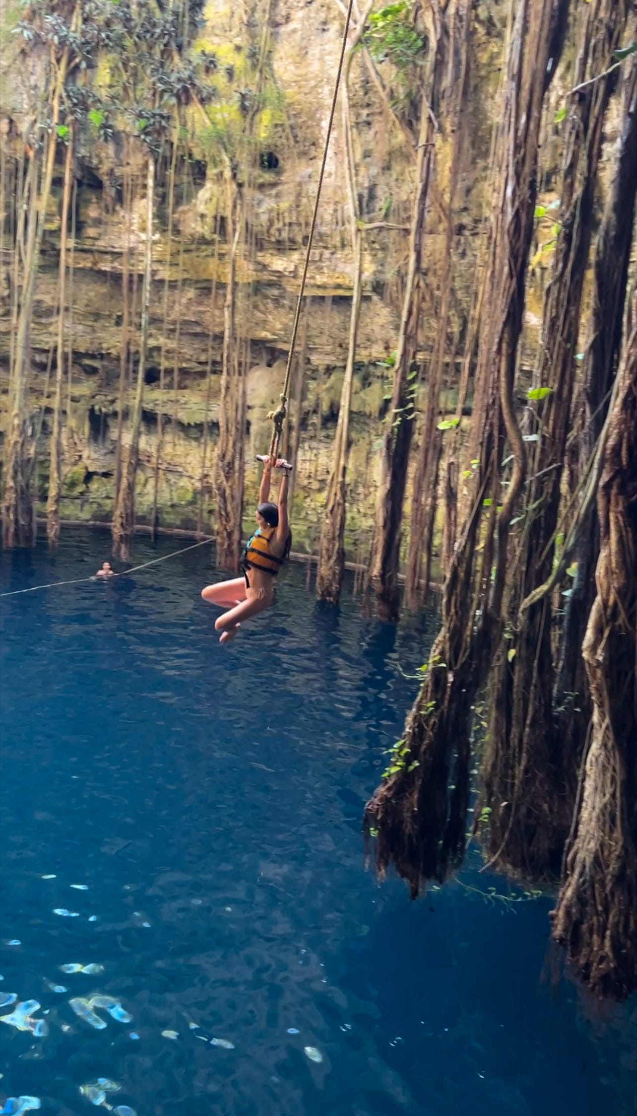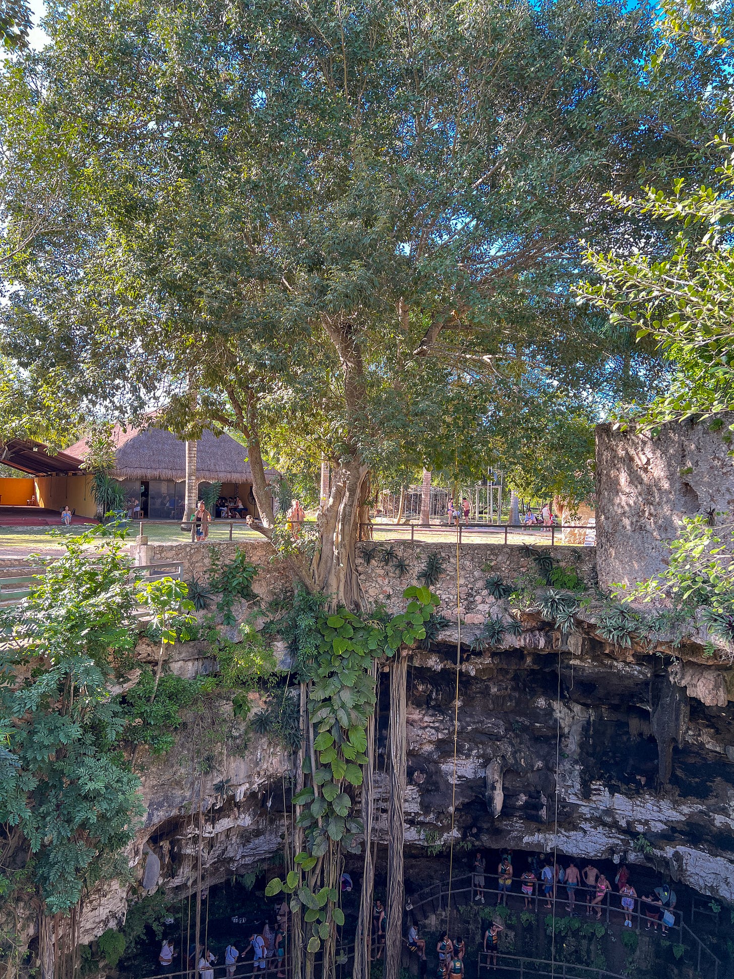 can you believe that those hanging down tarzan looking ropes are actually roots of trees?!?! literal aerial tree roots that dip down into the sink hole to get water….. … . . .. so trippy! below is a view from above ground.